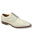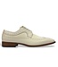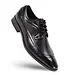 This is a men's lace-up dress shoe featuring a woven/texture pattern on the upper, complemented by brogue-style perforations along the edges. It has an elongated, tapered toe, a low stacked heel, and a polished finish Read more..